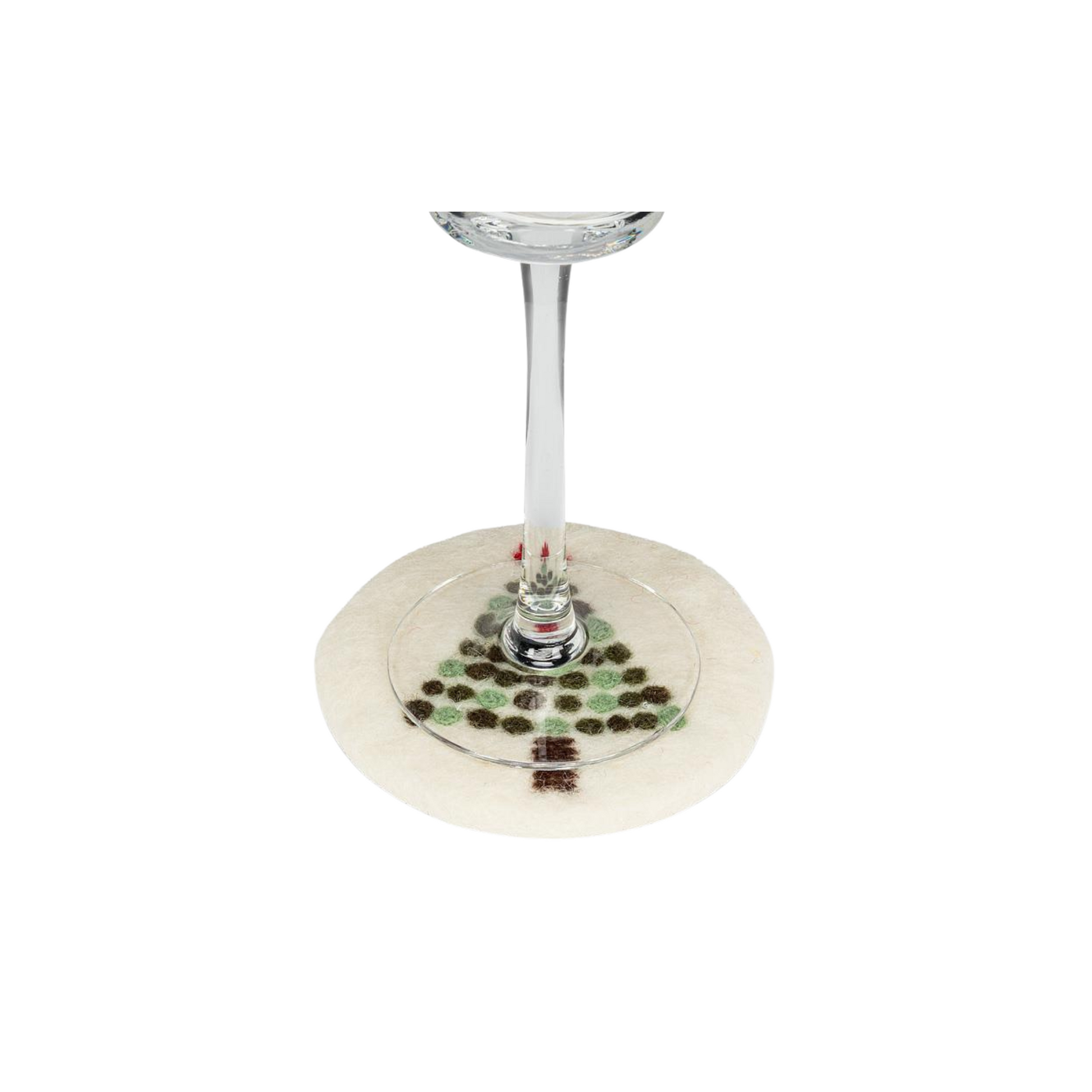 Made from 100% sheep wool and handcrafted by female artisans in Nepal, this elegant circular coaster is accented with a decorated tree for a playful complement to your kitchen or dining room decor.