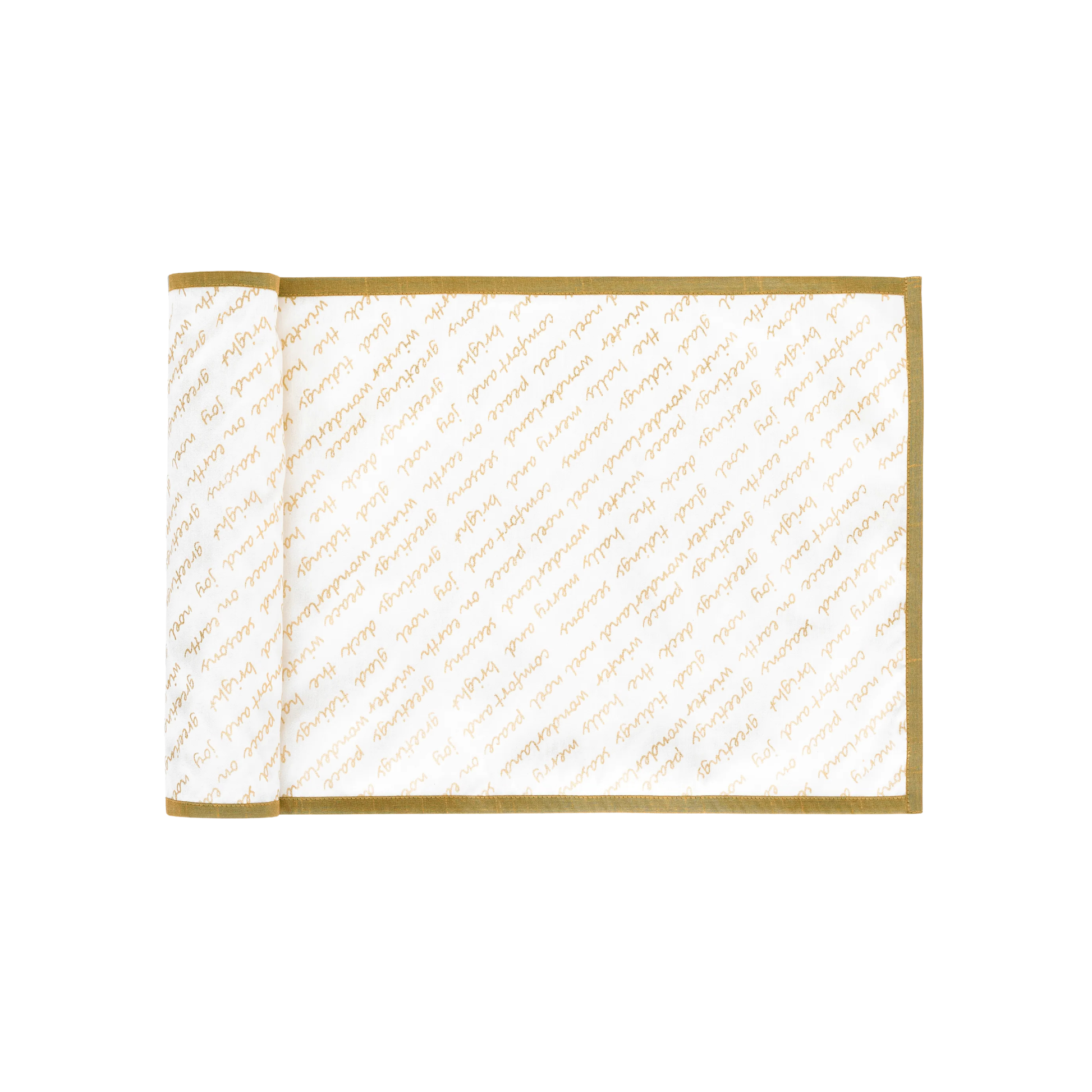 Featuring elegant holiday lettering against an ivory backdrop, accented with shimmering gold details, this runner captures the warmth and joy of the season.