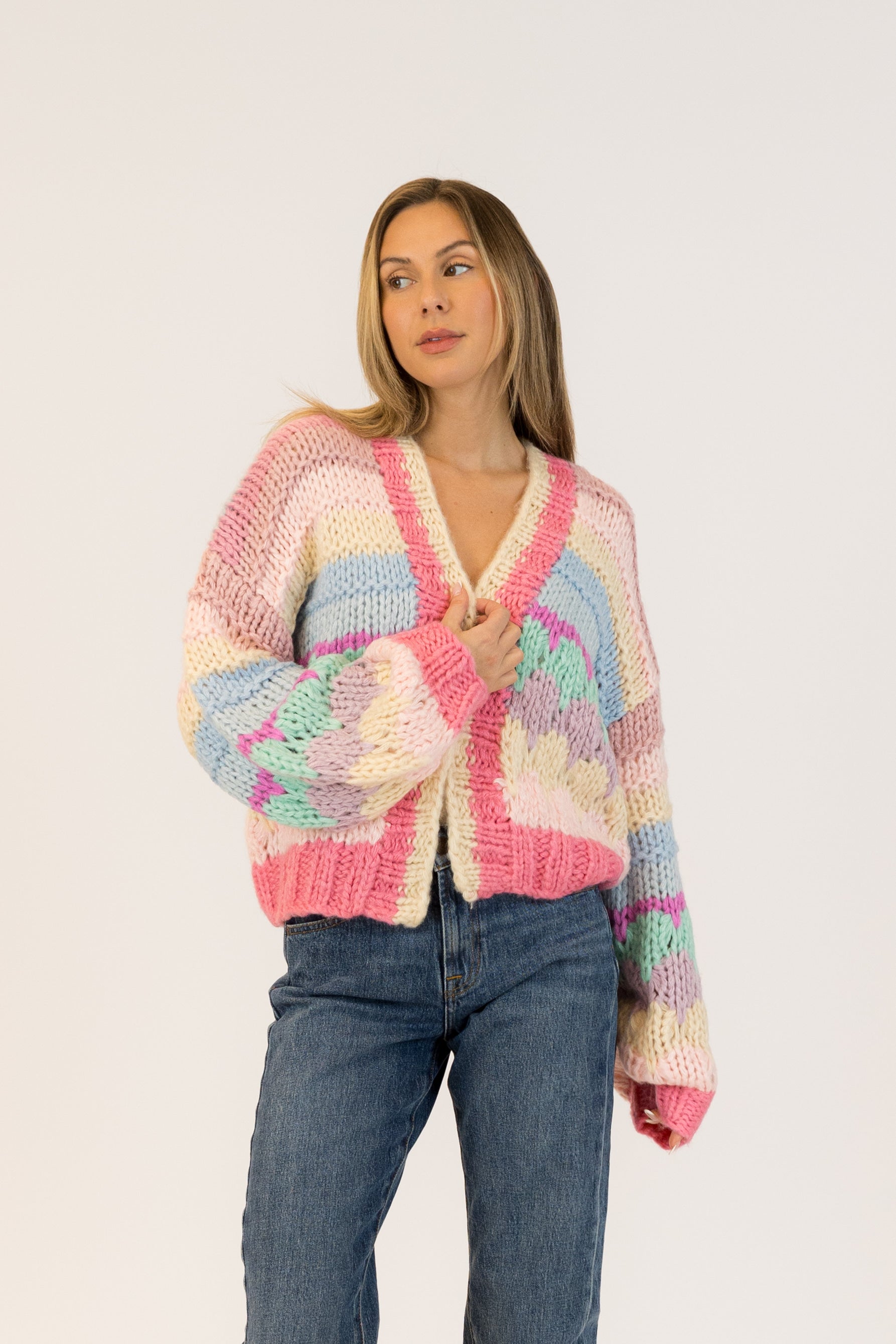 This handmade open cardigan features a colorful multi-stripe pattern that adds a vibrant and playful touch to your wardrobe. The bold mix of hues brings energy and personality to any outfit, making it a standout piece.