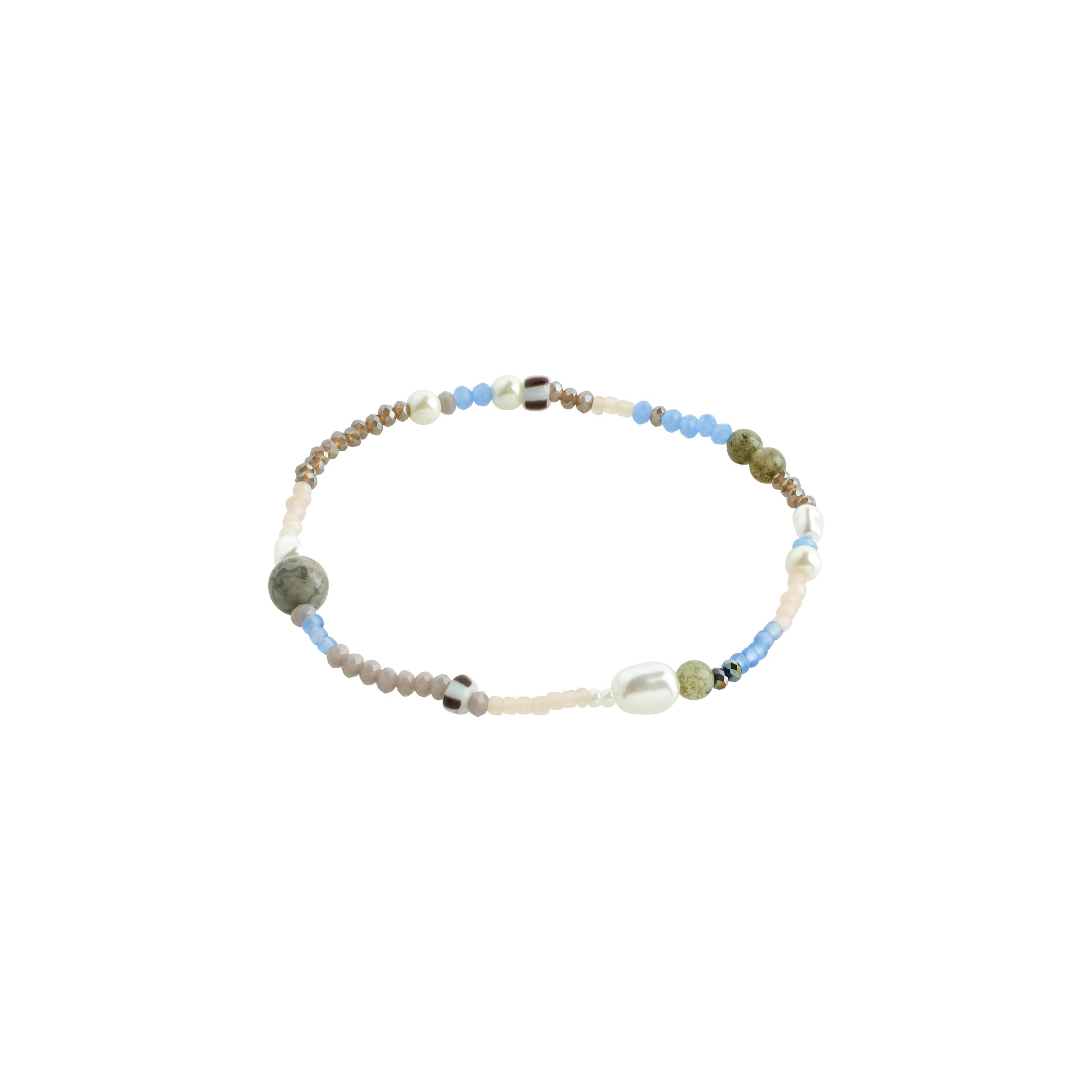 Beautiful pearl bracelet with genuine freshwater pearls and the semi-precious stone labradorite. Small, faceted glass beads in shades of blue combined with the different sizes and shapes of the stones give the bracelet an effortless and organic look. The perfect item to combine with other bracelets in a trendy, stacked look for a unique and personal style. The bracelet is assembled with a durable Lycra elastic and fits most wrists. It measures 16.5 cm.