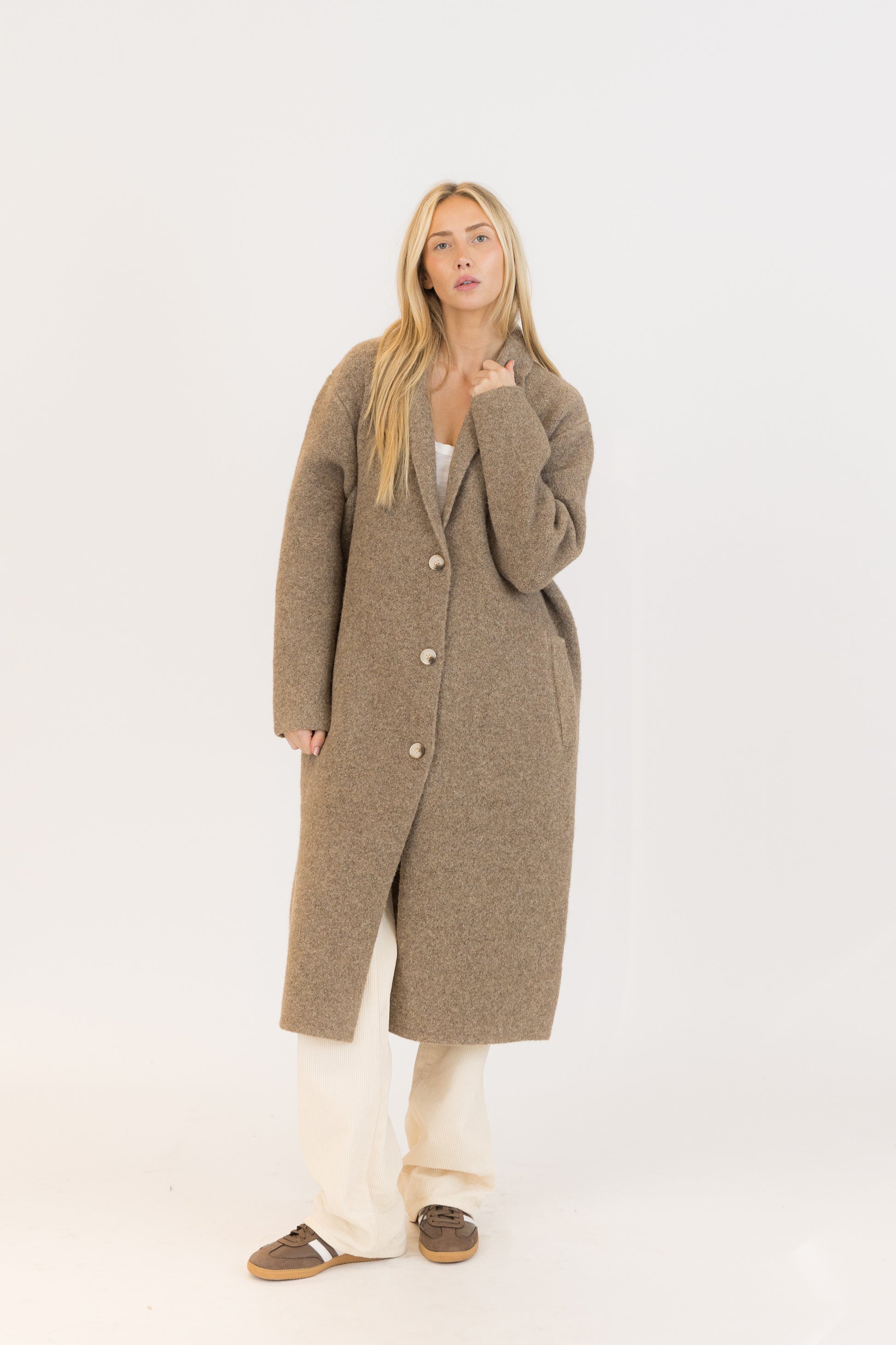 The Victoria oversized coat uses recycled materials to create a fashionable and environmentally concious garment. Featuring a notch collar, and slanted pockets, this coat can be worn everyday. Its oversized fit offers a relaxed and cozy look, perfect for layering over any outfit.